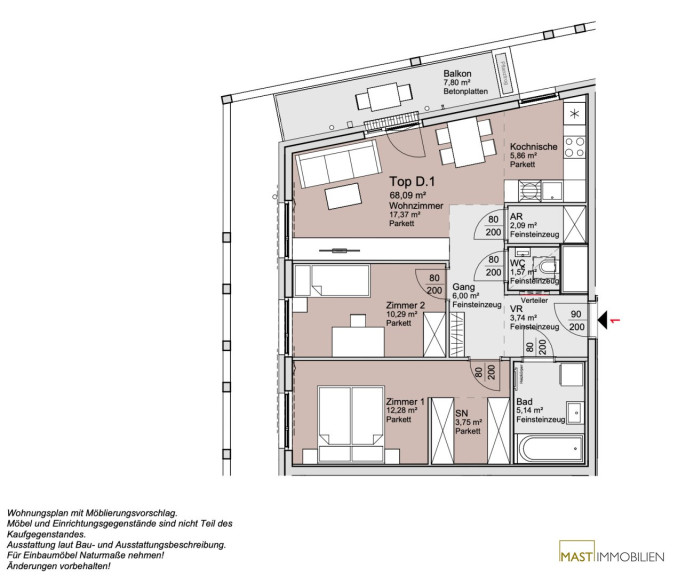 Die Wohnung befindet sich im 1. Liftstock und verfügt über 68,09 m² Wohnfläche + einen 7,80 m² großen Balkon.