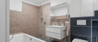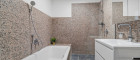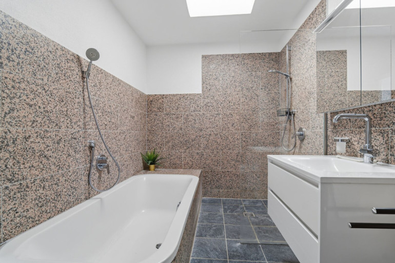 Das Badezimmer ist hochwertig ausgeführt und mit edlen Fliesen ausgestattet. Es verfügt über eine Dusche, eine Badewanne sowie ein WC.