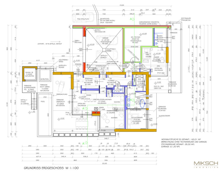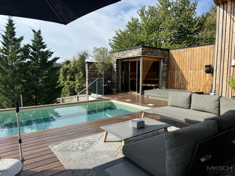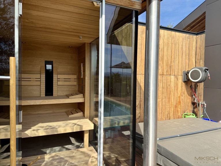 Parkett, Fliesen, Fußbodenheizung, Einbauküche, Bad mit Fenster, Badewanne, Dusche, Garage, Parkplatz(Duplex), Wasch/Trockenraum, Alarmanlage, Sauna, Swimmingpool