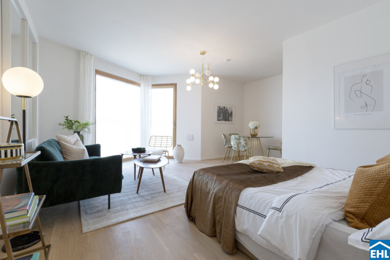 Sonnwendviertel: 1-Zimmer-Wohnung mit Balkon in der 14. Etage – Fitnessraum, Co-Working & Rooftop-Terrasse inklusive!