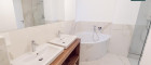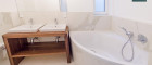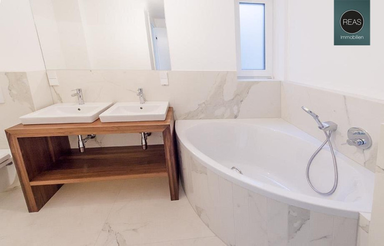 - 1 Bad mit WC, Eckbadewanne, Dusche samt Glaswand, Doppelwaschbecken, Spiegel sowie einem Fenster