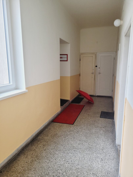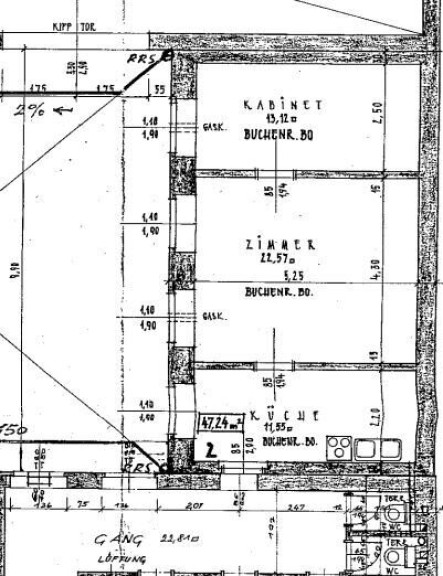 Der Zutritt zum Büro erfolgt über das allgemeine Stiegenhaus. Im Vorraum befindet sich rechts das Badezimmer mit Dusche und WC (am Grundriss nicht eingezeichnet). Im Vorraum weiter gelangt man in das erste große Zimmer. Weiter geht es in das zweite kleinere Zimmer. Alle Fenster blicken Richtung Nordwesten in den Innenhof des Hauses. Dadurch ist das Büro angenehm ruhig.