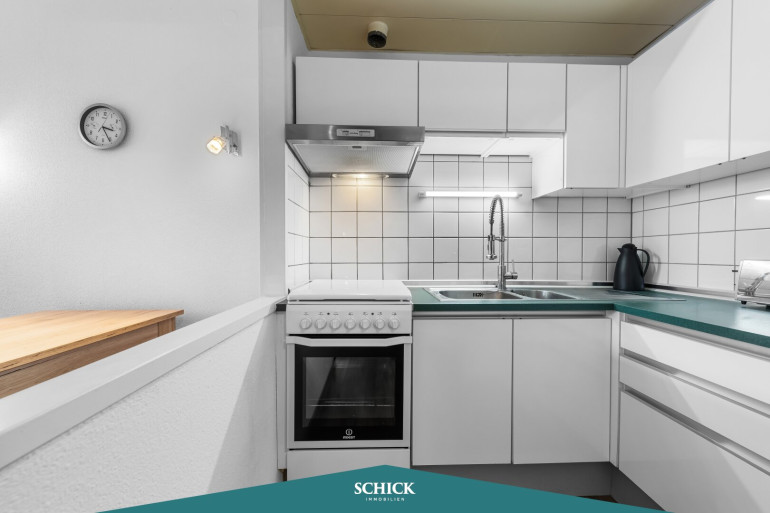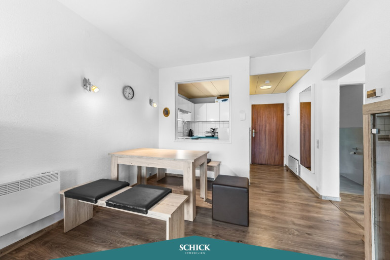 Das Essen richten Sie in der Einbauküche mit E-Geräten und Durchreiche. Direkt angeschlossen ist das offene Wohnzimmer mit Platz für gemütliche Essen und Zugang zur Loggia. Vom Schlafzimmer aus gelangen Sie ebenfalls auf die Loggia. Der Flur bietet sich für einen Homeoffice-Bereich an. Das Bad verfügt über eine Dusche. Die Toilette ist separat untergebracht.