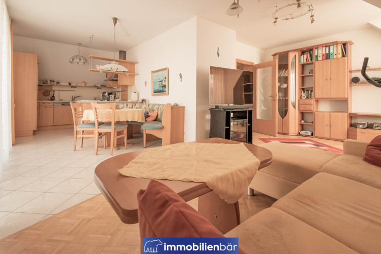 Der offene und großzügige Wohnbereich bildet das Herzstück der Wohnung und schafft mit seinen großen Fensterflächen ein helles, freundliches Wohngefühl.
