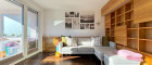 Maßgefertigte Einbaumöbel vom Tischler (Garderobe, Kleiderschränke und Bücherregal aus Kernesche-Echtholzfurnier) sowie hochwertige Leuchten runden das Angebot ab.