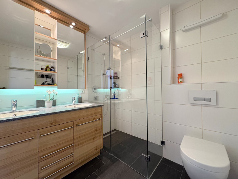 Das moderne Badezimmer ist mit einer begehbaren Dusche, Doppelwaschbecken aus Feinsteinzeug, WC, großer Spiegelfläche mit integrierten Staufächern sowie einem Waschmaschinenanschluss ausgestattet.
