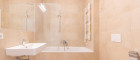 Das Badezimmer besticht durch zeitloses Design und verfügt über eine Badewanne inklusive Duschwand, Handtuchheizung, Waschbecken, Toilette und Waschmaschinenanschluss.