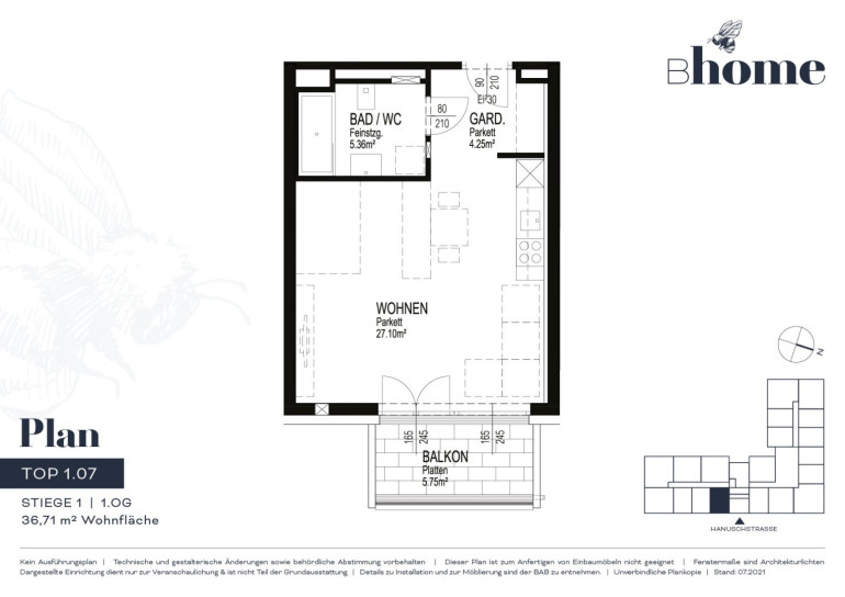 Diese optimal aufgeteilte, ca. 36,71m² große Wohnung befindet sich im 1. Obergeschoß und ist sowohl barrierefrei mittels Lift als auch über das Stiegenhaus erreichbar.