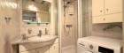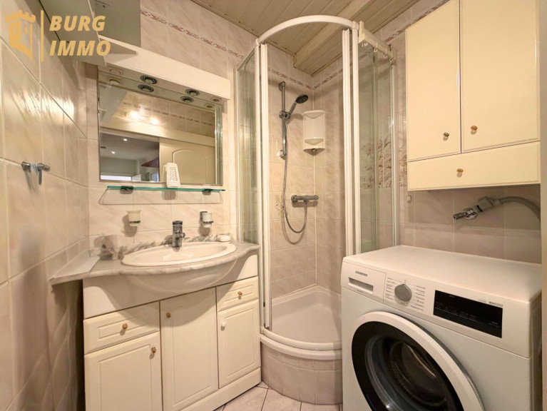 das kleine, aber feine Badezimmer mit Dusche und Platz für Waschmaschine