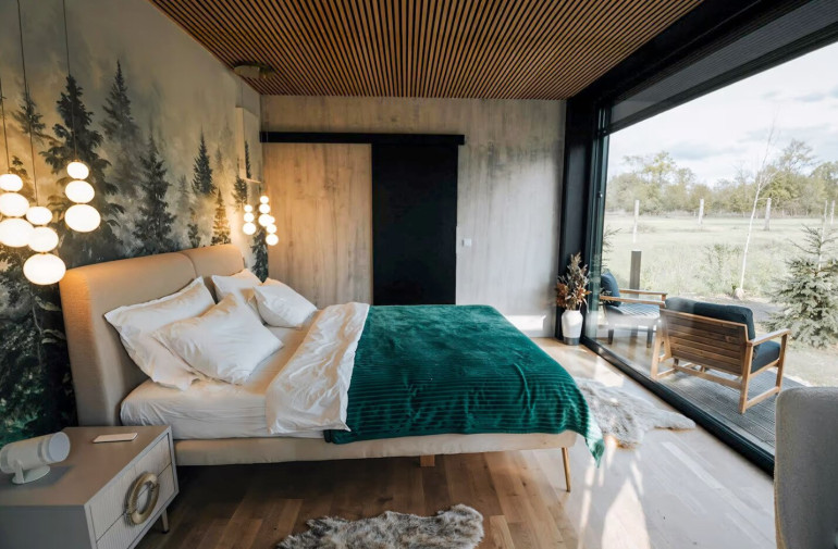 Die Tiny Houses überzeugen durch ihre durchdachte Architektur und hochwertige Ausstattung: Echtholz-Parkettböden schaffen eine warme Atmosphäre, großflächige Fensterfronten öffnen den Blick auf Weinberge und Wiesen und lassen zugleich viel Tageslicht herein. Dank modernster Bauweise mit Passivhaus-Zertifizierung, Aluminiumrahmen und Holzfaser-Dämmung genießen Sie ein komfortables Raumklima zu jeder Jahreszeit.