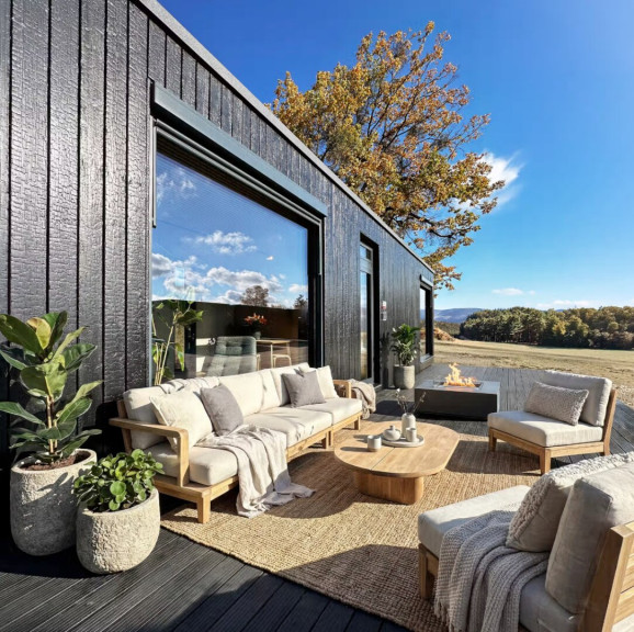Jedes Haus verfügt über eine eigene Terrasse – der ideale Ort, um bei einem Glas steirischem Wein den Blick über die Rebhänge schweifen zu lassen. Ob als persönlicher Rückzugsort, Ferienimmobilie oder renditestarke Investition: Tiny Vineyards stehen für ein Wohnerlebnis, das Natur und Design harmonisch verbindet.