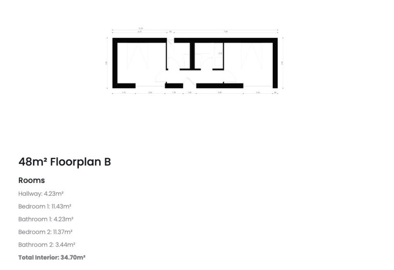 Floorplan B (2 Schlafzimmer): Zwei Schlafbereiche mit jeweils eigenem Bad – maximale Schlafkomfort-Nutzung auf 48 m².