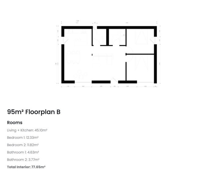 Floorplan B (2 Schlafzimmer): Zwei Schlafzimmer, offener Wohnbereich, effiziente Raumnutzung – perfekt für Paare mit Homeoffice oder Gäste.