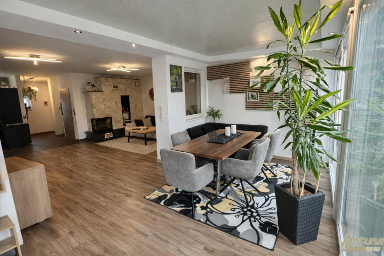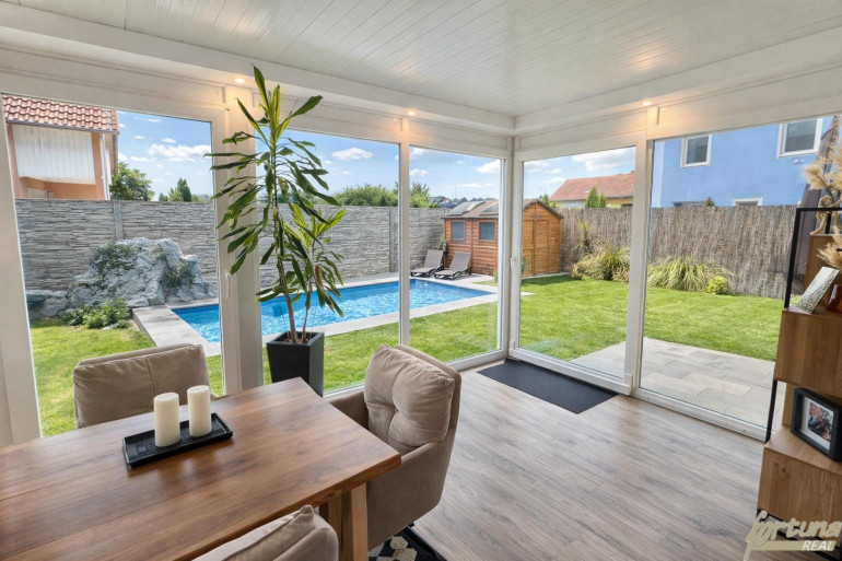 Ein besonderes Highlight ist das offen gestaltete Esszimmer (10,97m²): Der ursprünglich vorhandene Wintergarten wurde elegant in den Wohnbereich integriert und bietet dank großer Fensterflächen viel Tageslicht sowie einen wunderschönen Blick in den Garten und auf den Pool, ein perfekter Ort für gemeinsame Mahlzeiten und gesellige Abende.