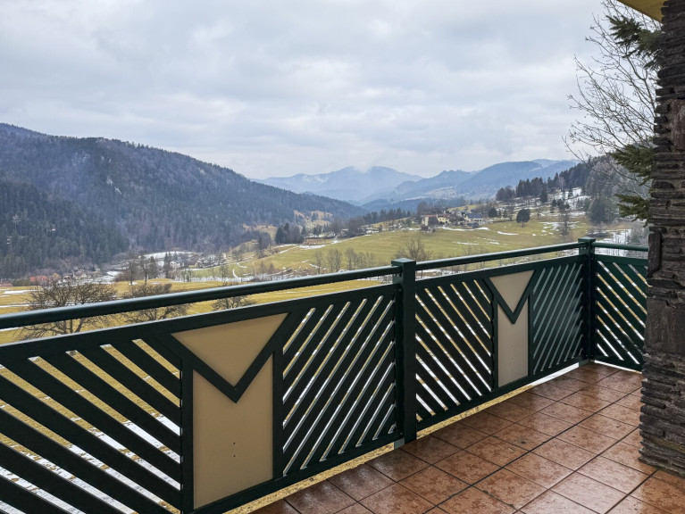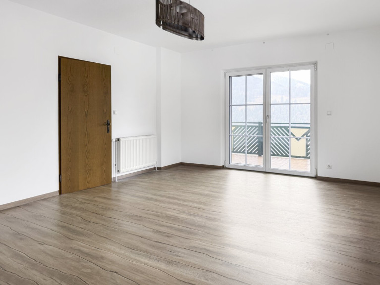 Das Wohnzimmer bildet das Herzstück des Hauses. Von hier aus tritt man direkt auf den rund 16,5 m² großen Balkon, der mehr ist als ein zusätzlicher Außenbereich. Er wird schnell zu einem festen Bestandteil des Wohnens - für den ersten Kaffee am Morgen, für ruhige Abende, für Momente, in denen man einfach hinausblickt und bleibt. Der weite Ausblick in die Landschaft begleitet dabei still und selbstverständlich.
