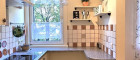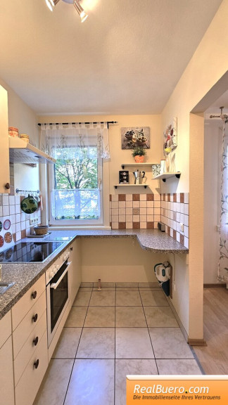 - Einbauküche mit Wand/Bodenfliesen, Kühlschrank, Herd mit Ceranfeld, Mikrowelle, Koch- und Essgeschirr