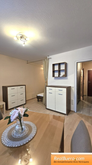 - Wohnzimmer mit abgegrenztem Schlafbereich (Bett 1.40m) neuem Laminat-Boden, Tisch 90x90, 2