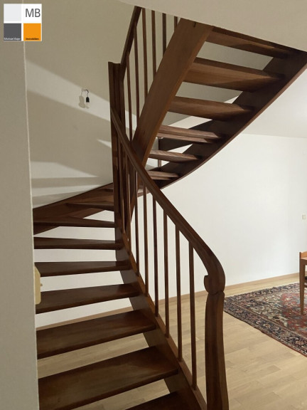 Auf der ersten Ebene befindet sich ein großzügiges Vorzimmer, Gäste-WC, die Küche mit Essplatz und angeschlossener Speisekammer, der offene rund 50 m² große Wohn-/Essbereich mit einer vorgelagerten ca. 20 m² großen Terrasse/Loggia, sowie einer schönen geschwungenen Holztreppe in den oberen Bereich.