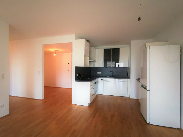 Highlights: Helles Wohnzimmer mit Luxusküche & Smart-Home, 2 Schlafzimmer, Bad mit Wanne, separates WC, Südwest-Loggia mit Donaublick – von allen Zimmern begehbar.