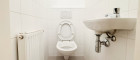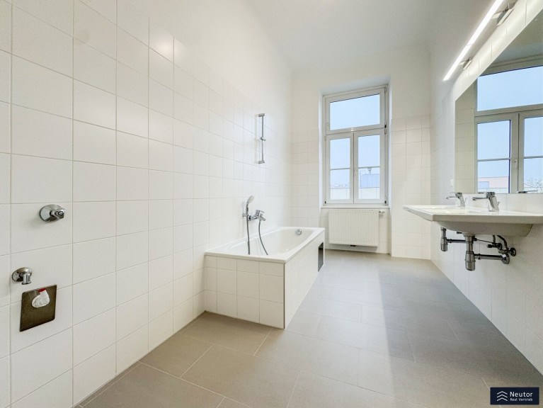 Das großzügige Badezimmer, welches ebenfalls über ein Fenster verfügt, lädt mit seiner eleganten Ausstattung zum Entspannen und Wohlfühlen ein. Ergänzt wird der das stilsichere Residieren durch ein separates WC im Eingangsbereich.