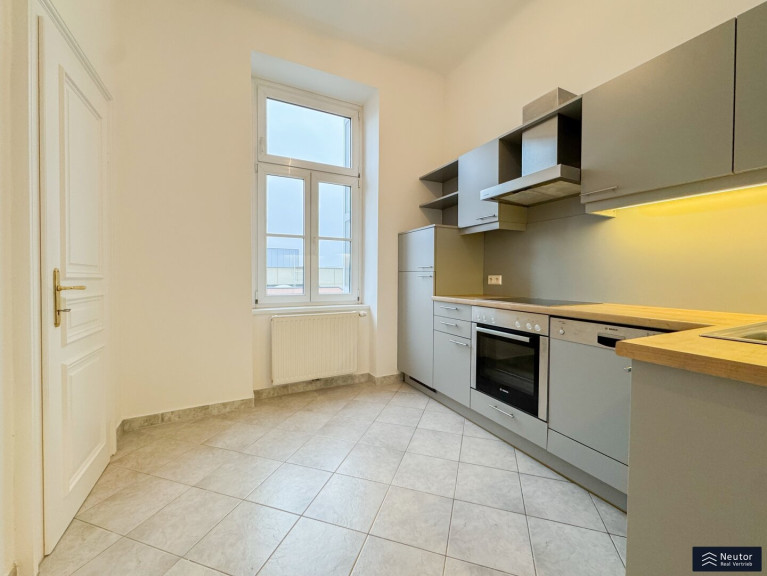 Die geräumige, separat angelegte Küche verfügt über ein großes Fenster, welches den Raum mit natürlichem Licht durchflutet und zum Verweilen und Kochen einlädt. Ein praktischer Abstellraum ergänzt den Raum ideal und schafft zusätzlichen Stauraum für Ihre Haushaltsutensilien.