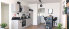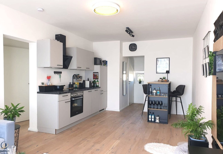 Vom Vorraum aus betreten Sie den offen gestalteten Küchenbereich, der nahtlos in das großzügige Wohn- und Esszimmer übergeht. Hier können Sie gemeinsame Mahlzeiten genießen und entspannen. Vom Wohn-/Esszimmer aus gelangen Sie auf den ca. 5 m² großen Balkon, der Ihnen einen schönen Blick ins Grüne bietet und Platz für eine gemütliche Sitzecke hat.