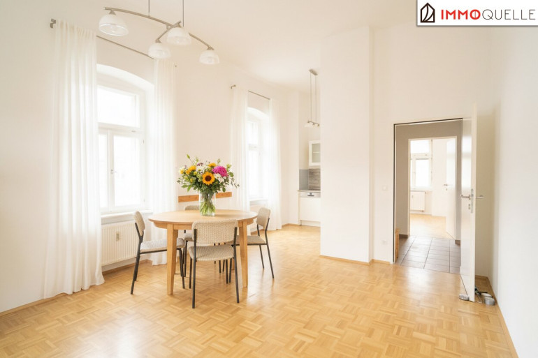 Links vom Flur öffnet sich der großzügige Wohn-Essbereich - mit südlicher und westlicher Ausrichtung, durchflutet von natürlichem Licht. Die moderne Einbauküche ist harmonisch integriert und lädt zum Kochen, Genießen und Zusammensein ein. Große Fensterfronten und edler Parkettboden schaffen eine warme, einladende Atmosphäre.