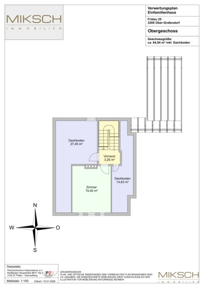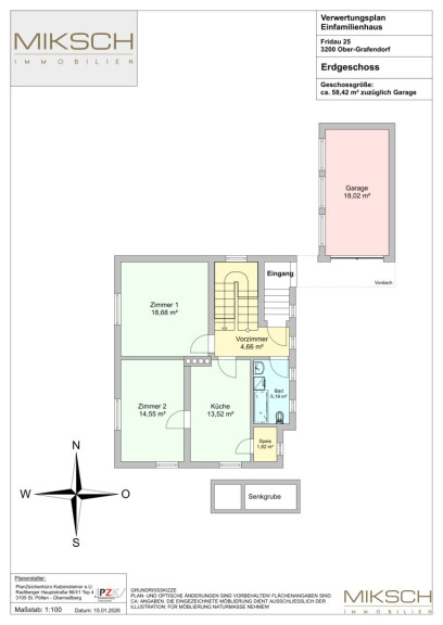 Die Wohnfläche von ca. 94,5 m² verteilt sich auf Erdgeschoss und Dachgeschoss und bietet ausreichend Platz für Paare oder Familien. Ergänzt wird das Raumangebot durch eine Nutzfläche von ca. 60,6 m², bestehend aus einem großzügigen Keller sowie einer Garage.