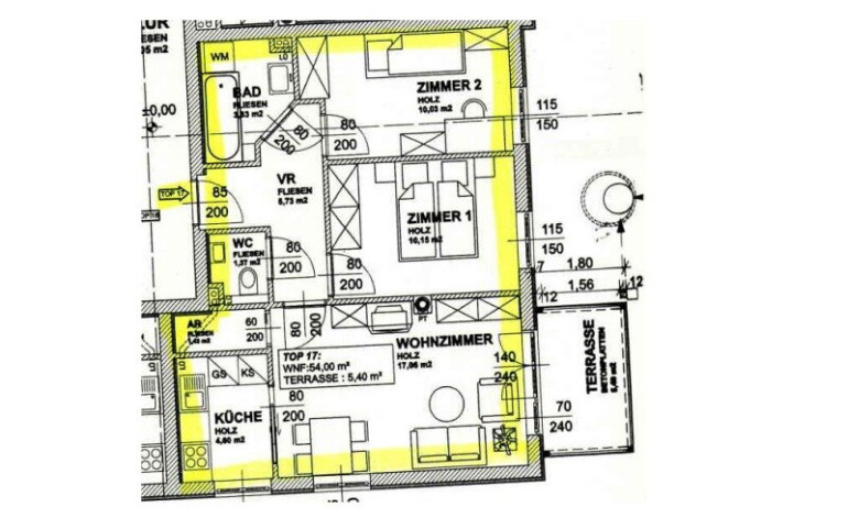 Raumaufteilung: Vorraum, Wohnküche, 2 Zimmer, Badezimmer, WC, Abstellraum