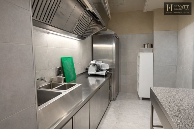 Die Küche ist effizient angeordnet und auf einen reibungslosen Arbeitsablauf ausgelegt. Ergänzt wird das Raumangebot durch Lagerflächen sowie sanitäre Einrichtungen für Gäste und Personal.