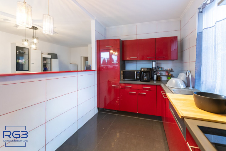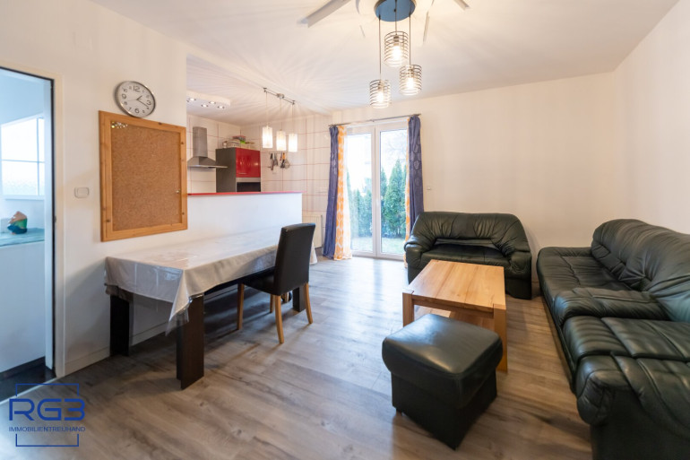 Das Wohnzimmer ist hell und führt direkt auf die Terrasse und in den kleinen Garten. Genau das, was vielen Wohnungen fehlt: ein Stück draußen nur für sich. Die Küche liegt separat, gut nutzbar und nicht mitten im Wohnbereich.