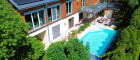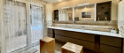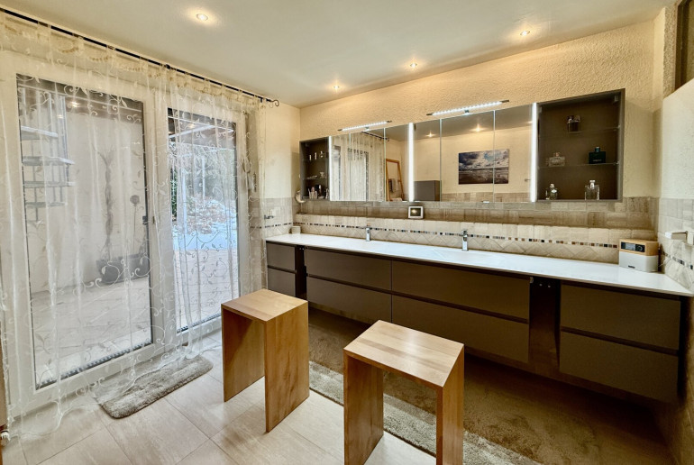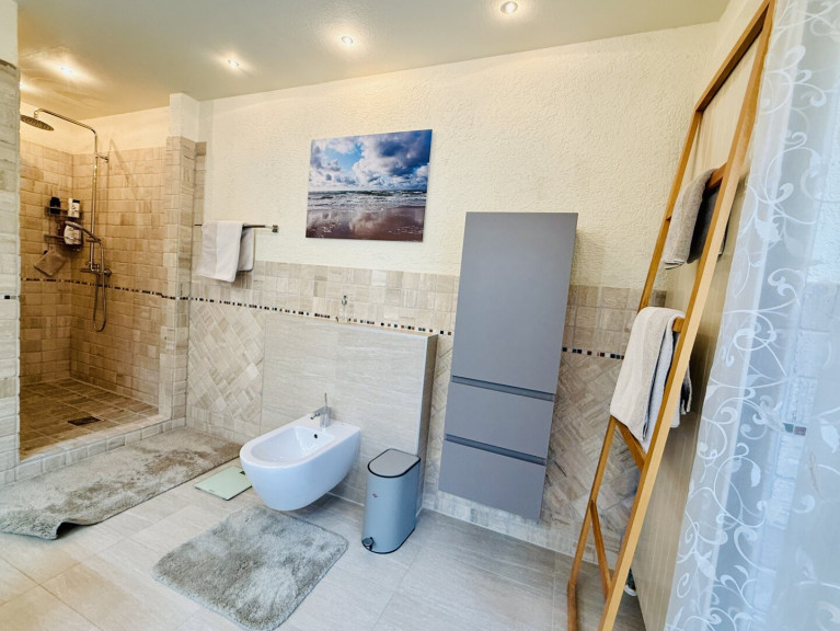 Das elegante, helle Badezimmer lässt keine Wünsche offen: Doppelwaschbecken, Walk-in-Dusche und Bidet schaffen eine private Wellnessoase. Von hier aus gelangen Sie direkt auf die Terrasse und können anschließend im beheizten Pool entspannen.