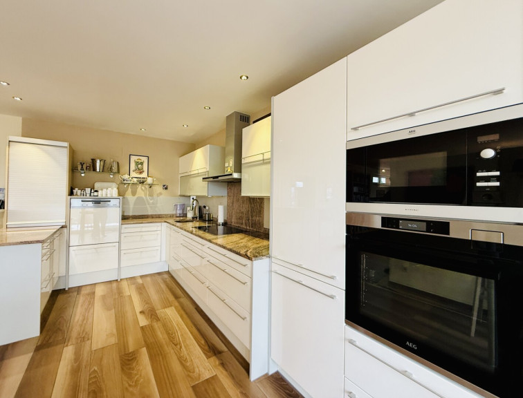 Die hochwertige Ausstattung umfasst edle Fliesen- und Parkettböden sowie eine Fußbodenheizung im Obergeschoss, die für ein angenehmes Wohnklima sorgt. Die großzügige Küche ist mit hochwertigen Markengeräten ausgestattet und verfügt über einen gemütlichen Frühstücks-Essbereich. Ergänzt wird sie durch eine separate Back-Kitchen mit großem Wirtschaftsraum – ideal für den anspruchsvollen Alltag.