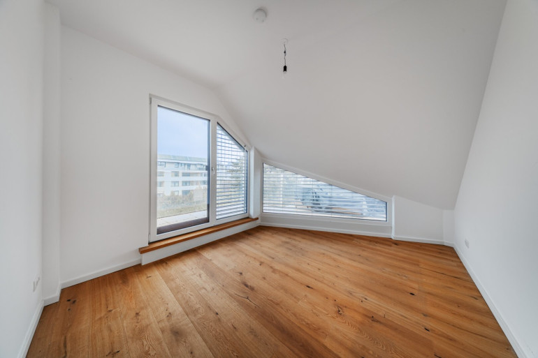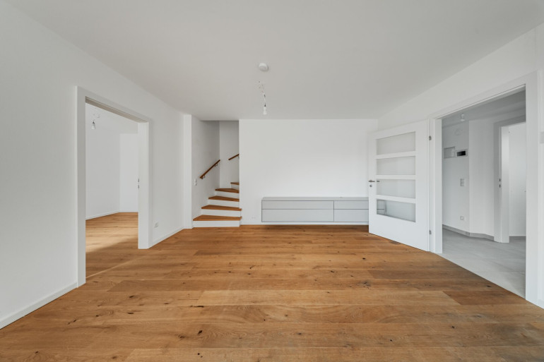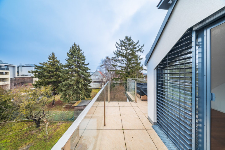 Der großzügige Wohnbereich mit großen Fensterflächen sorgt für ein angenehmes Tageslichtgefühl und bildet gemeinsam mit dem angrenzenden Balkon den zentralen Lebensmittelpunkt. Die Terrasse im oberen Stockwerk, welche an zwei Zimmer angrenzt, bietet zusätzliche Außenfläche zum Entspannen.
