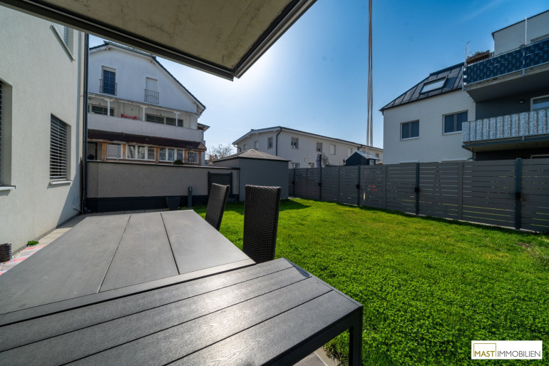 Die rund 30 m² große, westseitig ausgerichtete Terrasse sowie der etwa 100 m² große Eigengarten laden zu entspannten Stunden im Freien ein und bieten viel Platz für Erholung, Familie und Gäste.