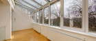 Der ursprünglich als Wintergarten eingereichte und heute offen in den Wohnbereich integrierte, verglaste Bereich mit elektrischer Markise sorgt für ein außergewöhnliches, lichtdurchflutetes und elegantes Wohnambiente.