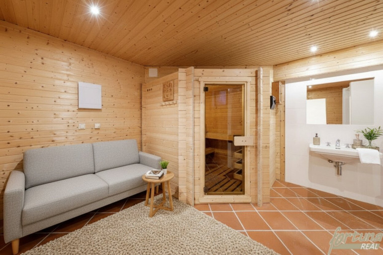 Zur Wohnung gehört ein ca. 25 m² großer Kellerbereich, bestehend aus zwei Räumen. Einer dieser Räume ist als exklusiver Spa-Bereich ausgeführt mit