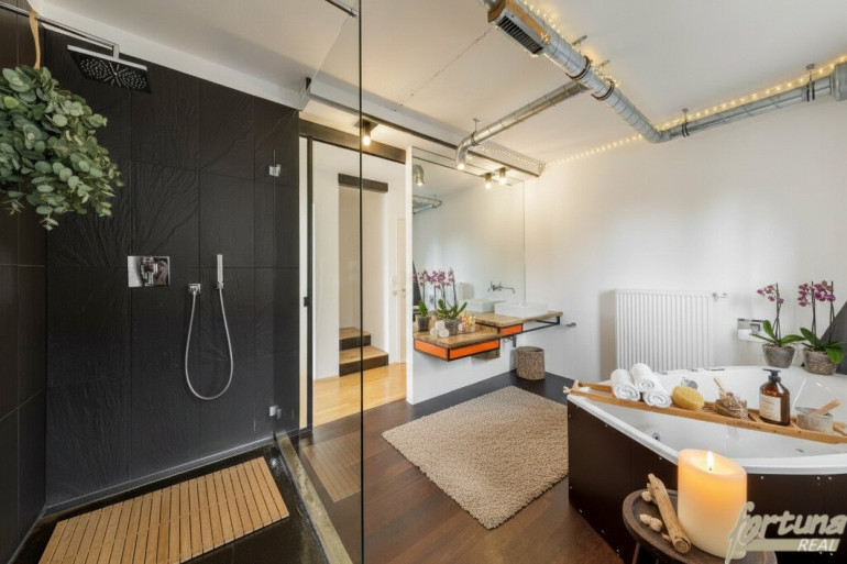 Das Badezimmer ist großzügig dimensioniert, fußbodenbeheizt, tagesbelichtet, hochwertig ausgestattet und bietet sowohl eine Walk-in-Dusche als auch eine Whirlpool-Badewanne.
