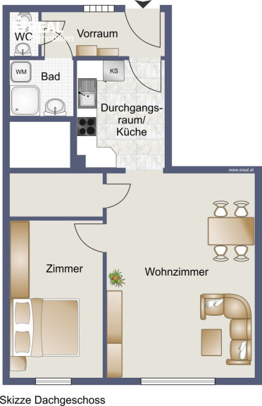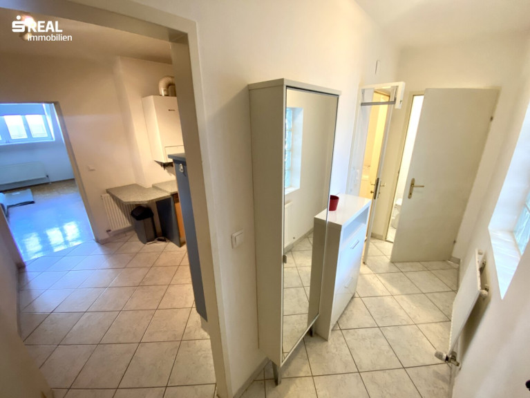 Die ostseitig ausgerichtete 2 Zimmer Wohnung liegt im 4. Stock mit Lift und ist zur Rüdigergasse, einer ruhigen Seitengasse der Schönbrunnerstraße ausgerichtet. Die Raumaufteilung ist für einen 2-Personen-Haushalt ausgelegt. Ein Bad mit Dusche, Waschbecken und Anschluss für Waschmaschine ist separates zum WC mit kleinem Waschbecken angeordnet. Der 2. Vorraum ist mit einer Einbauküche samt Geräten ausgestattet. Über das Wohnzimmer ist das Schlafzimmer begehbar. Ein Abstellraum bietet zusätzlich Stauraum.