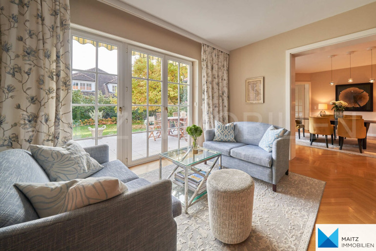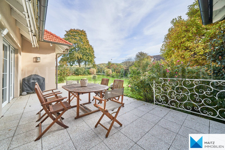 Vier Zimmer bieten direkten Zugang zur süd-westseitigen Terrasse mit Blick in den prächtigen Garten. Nord-ostseitig kann der Tag auf einer gemütlichen 8,4m²-Terrasse in der Morgensonne begrüßt werden.