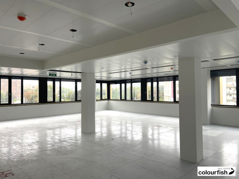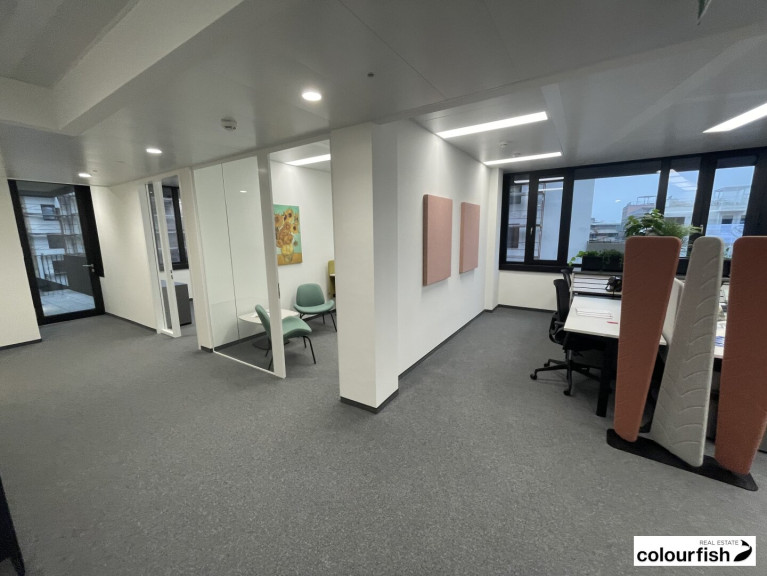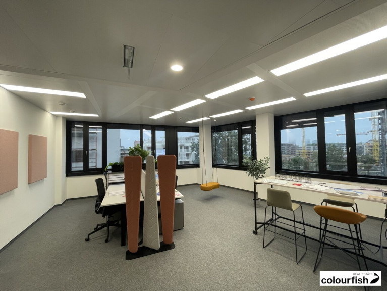 Das Bürogebäude umfasst rund 7.500 m² Nutzfläche, verteilt auf neun Obergeschoße. Die Büroebenen sind offen konzipiert und bieten pro Regelgeschoß bis zu 880 m² flexibel gestaltbare Mietfläche. Dadurch lassen sich unterschiedlichste Arbeits- und Organisationsformen umsetzen – von klassischen Einzel- und Gruppenbüros bis hin zu großzügigen Open-Space-Konzepten.