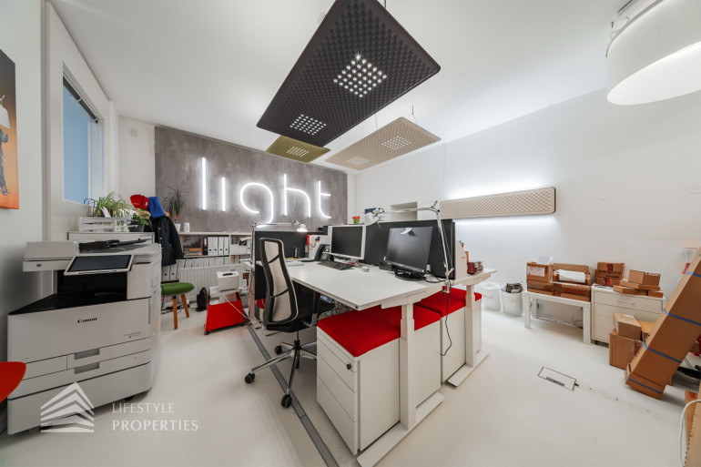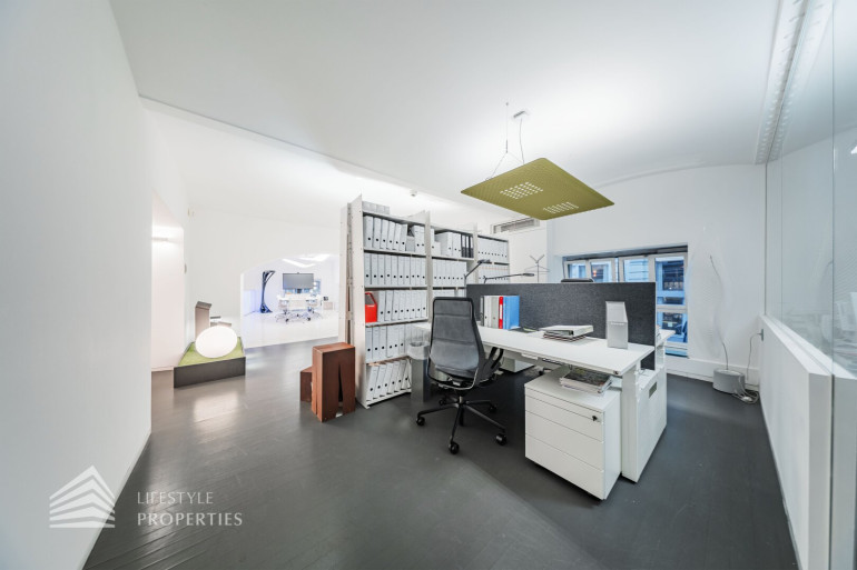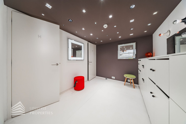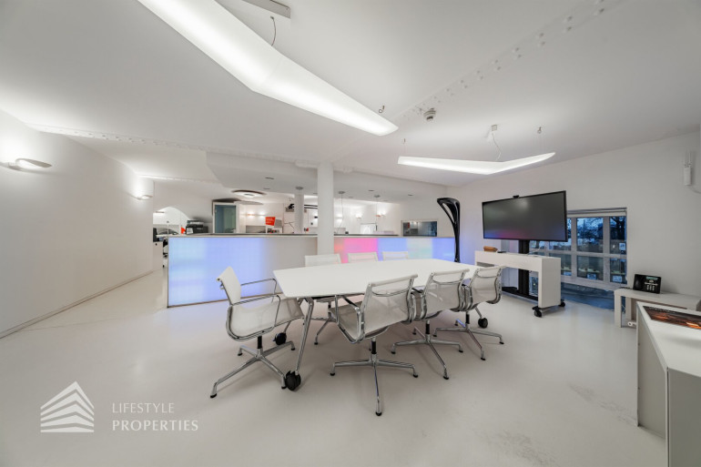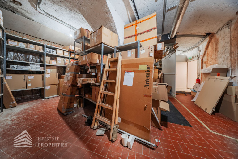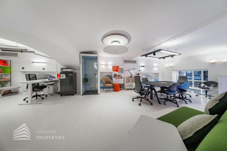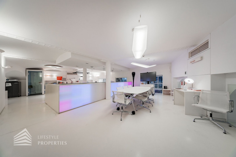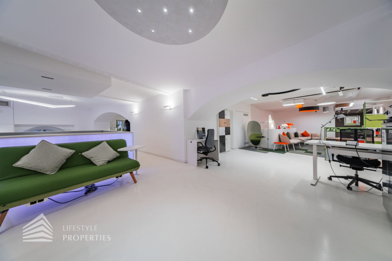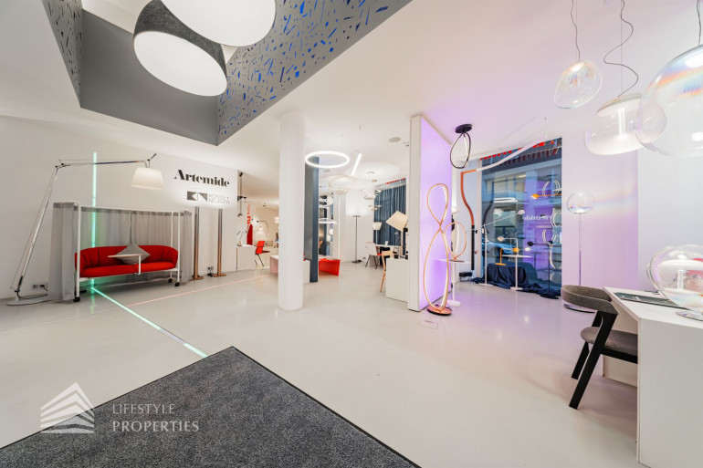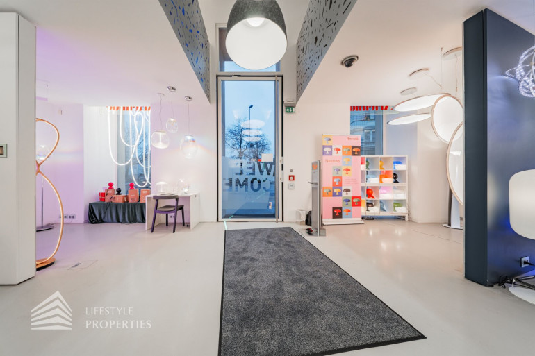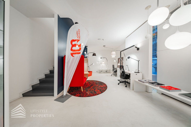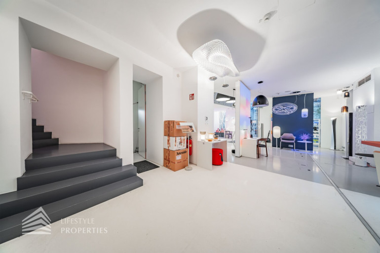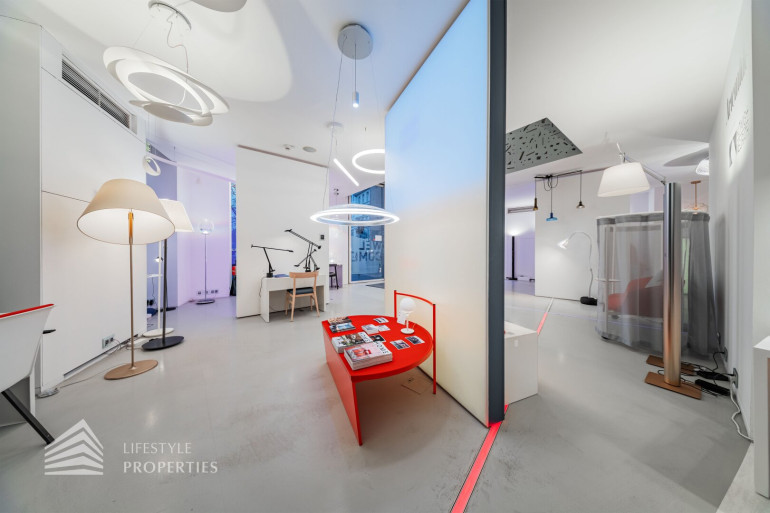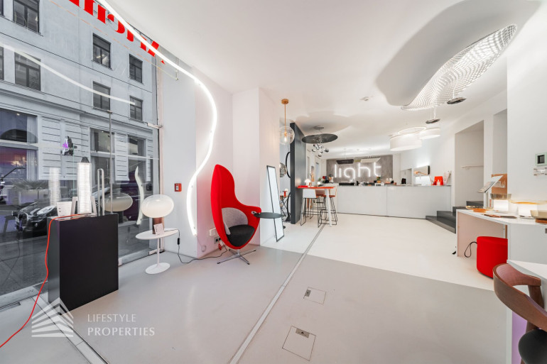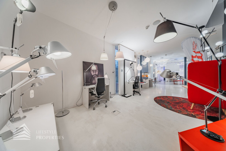 Durch die hohen Räume mit den großen Auslagenfenster ist das Geschäftslokal sehr hell und mit viel Tageslicht durchflutet.
