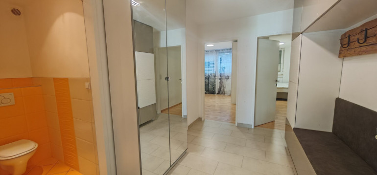 Die moderne Küche ist etwa acht Jahre alt, voll ausgestattet und sofort nutzbar. Das Badezimmer ist zeitlos gestaltet und verfügt über eine ebenerdig begehbare Dusche sowie Platz für Waschmaschine und Trockner. Ein separates WC ergänzt den Sanitärbereich. Zwei weitere Zimmer mit Laminatböden eignen sich ideal als Schlaf-, Kinder- oder Arbeitszimmer. Der geflieste Vorraum mit Garderobenbereich verbindet alle Räume funktional miteinander.