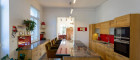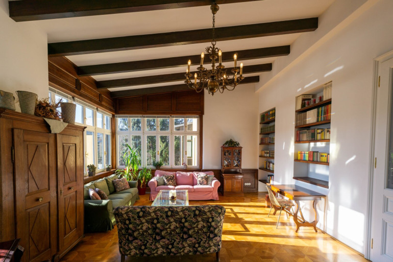 Die großzügige Hauptwohnung bietet einen offenen Wohn-, Ess- und Küchenbereich mit Kamin und 2,80 m hohen Doppelflügeltüren. Mehrere Ausgänge führen auf die Terrasse und in den Garten. Der private Bereich umfasst einen exklusiven Masterbedroom mit Ankleide und Bad sowie weitere flexibel nutzbare Zimmer.