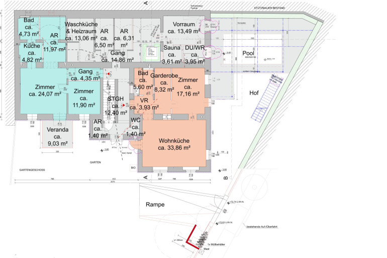 Zwei separat zugängliche Einheiten (ca. 69 m² und 62 m²) eignen sich ideal für Vermietung, Büro oder Mehrgenerationenwohnen. Ergänzt wird diese Ebene durch einen Wellnessbereich mit Indoor-Pool, vorbereitetem Saunaraum und direkten Gartenausgängen.
