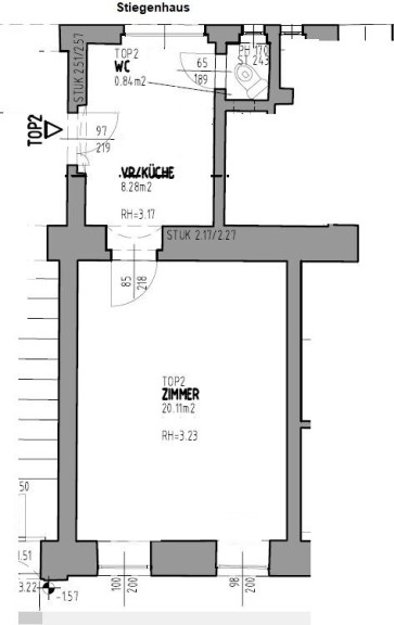 Top 2, Altbau zum Renovieren, Hochparterre, 1 Zimmer, Vorraum mit Küchenanschlüssen, extra WC (mit integrierter Dusche im WC)