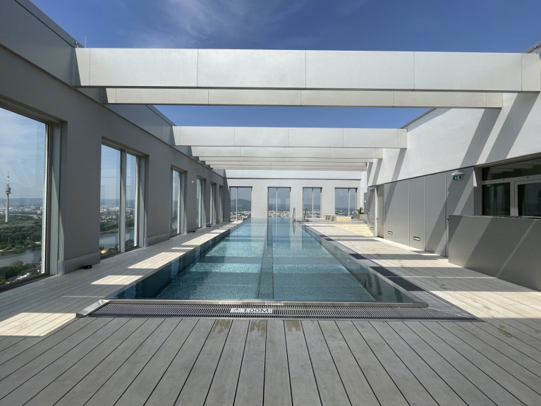 - Rooftop-Pool mit 19m Länge und Sonnendeck (33. Stock)