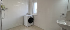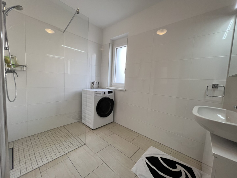 Badezimmer mit Fenster, Dusche, Waschbecken und Waschmaschine mit Trocknerfunktion (5,07 m²)