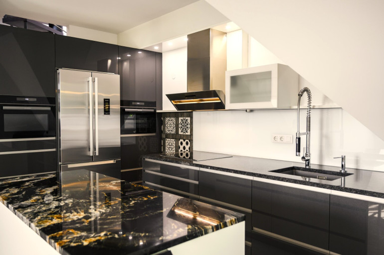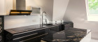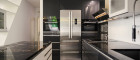 Die maßgefertigte Häcker-Einbauküche mit Hochglanz-Lackoberflächen (anthrazit metallic & weiß) und einer Granitarbeitsplatte überzeugt mit Funktionalität und Stil.