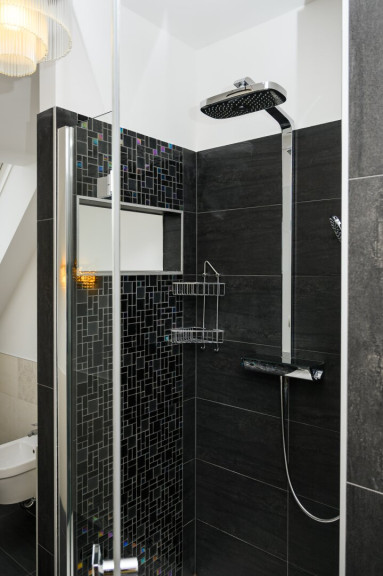 Großzügige Dusche mit Echtglas-Tür, Polymer-Duschtasse und Hansgrohe Raindance Duschsystem (Regendusche & Handbrause)